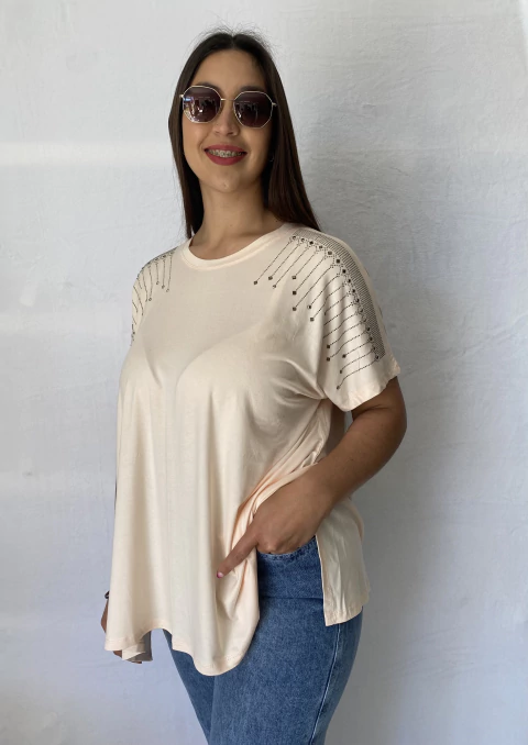 Remerón de tela viscosa, con aberturas laterales y diseño evasé. Presenta apliques de strass y tachas en la parte delantera superior.
